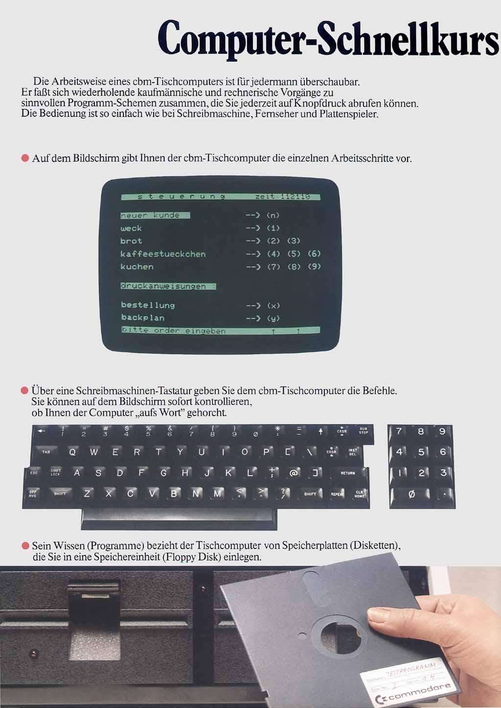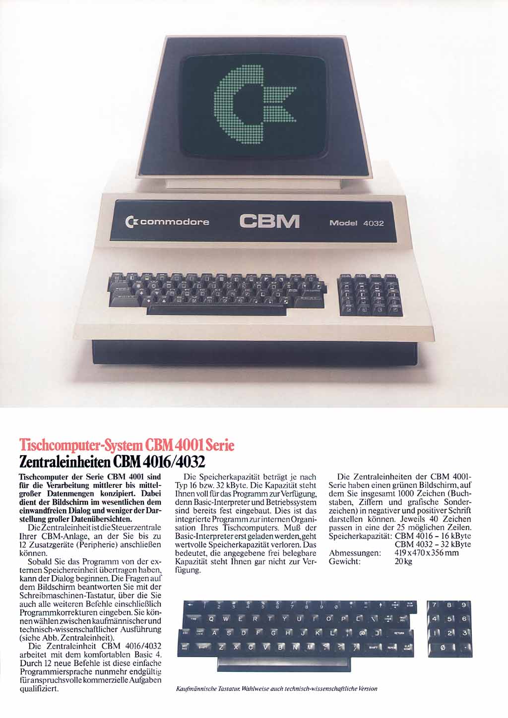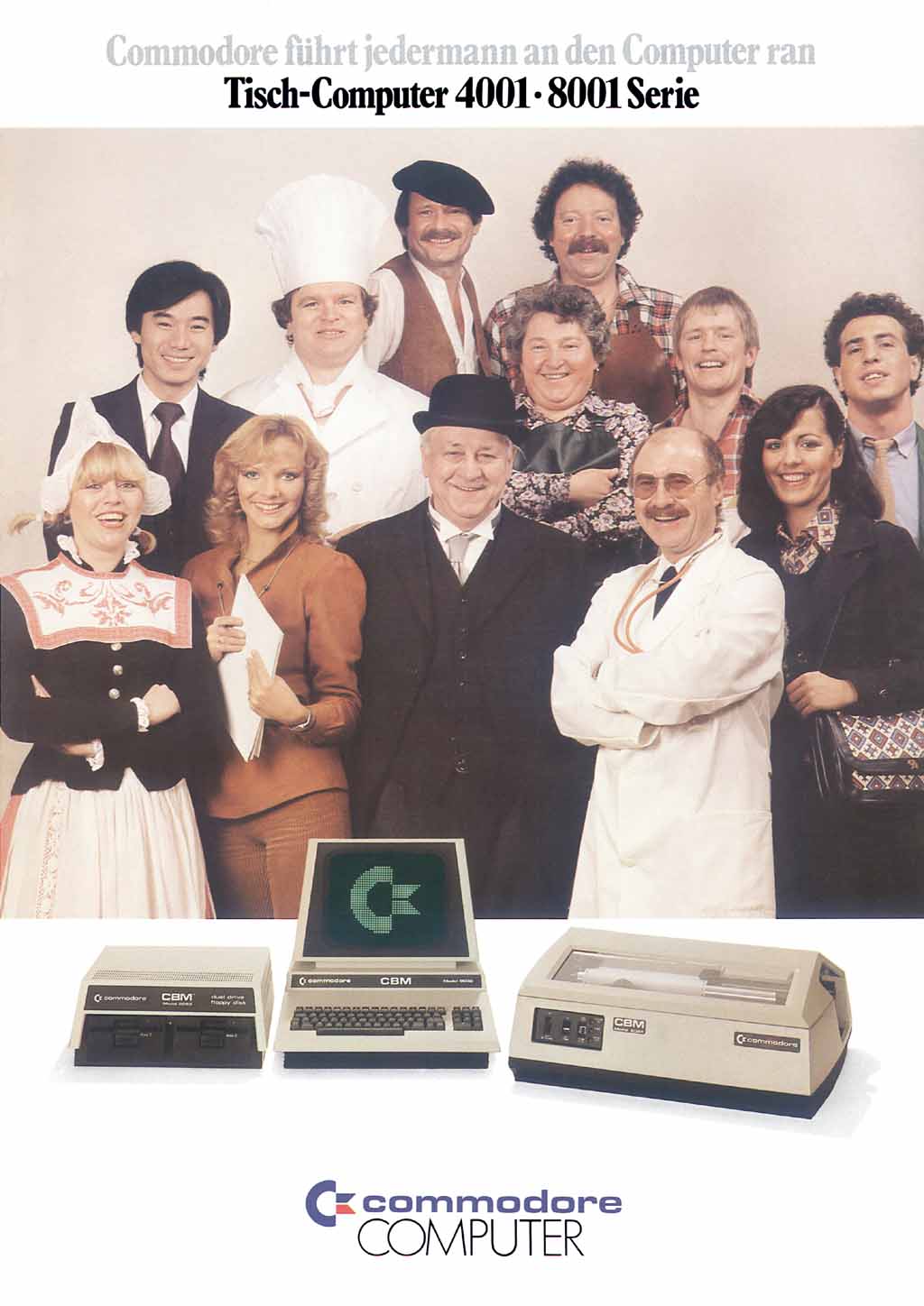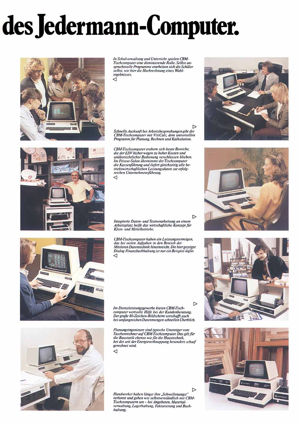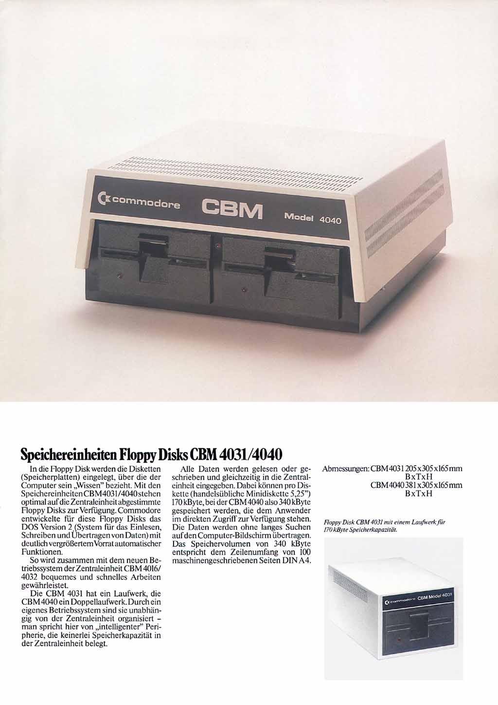 This prospectus of the year 1981 gives an overview of the CBM4000 and CBM8000 series and their periphery. Even it describes which computer is suitable for which purpose and how simple it is to operate them in the daily use. Typically for Commodore once more there are pictures of "Dummies". Later the CBM4031 were not installed in the shown case, but in the housing of the CBM2031, which had the same technology. Furthermore I do not know anything about the real existence of the 8"-disk-drives CBM8061 and CBM8062 described at page 10.