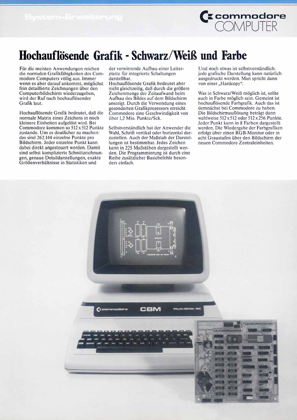 Likewise in the year 1982 the CBM4000 as well as the CBM8000 becomes capable of Hires-graphics! With this additional board it is possible to depict a resolution of 512 x 512 pixels at the integrated screen. The flyer includes the announcement of a graphics extension for the 700 series too. This extension should be able to depict each pixel in one of eight colours in the same resolution. An external monitor is required of course.