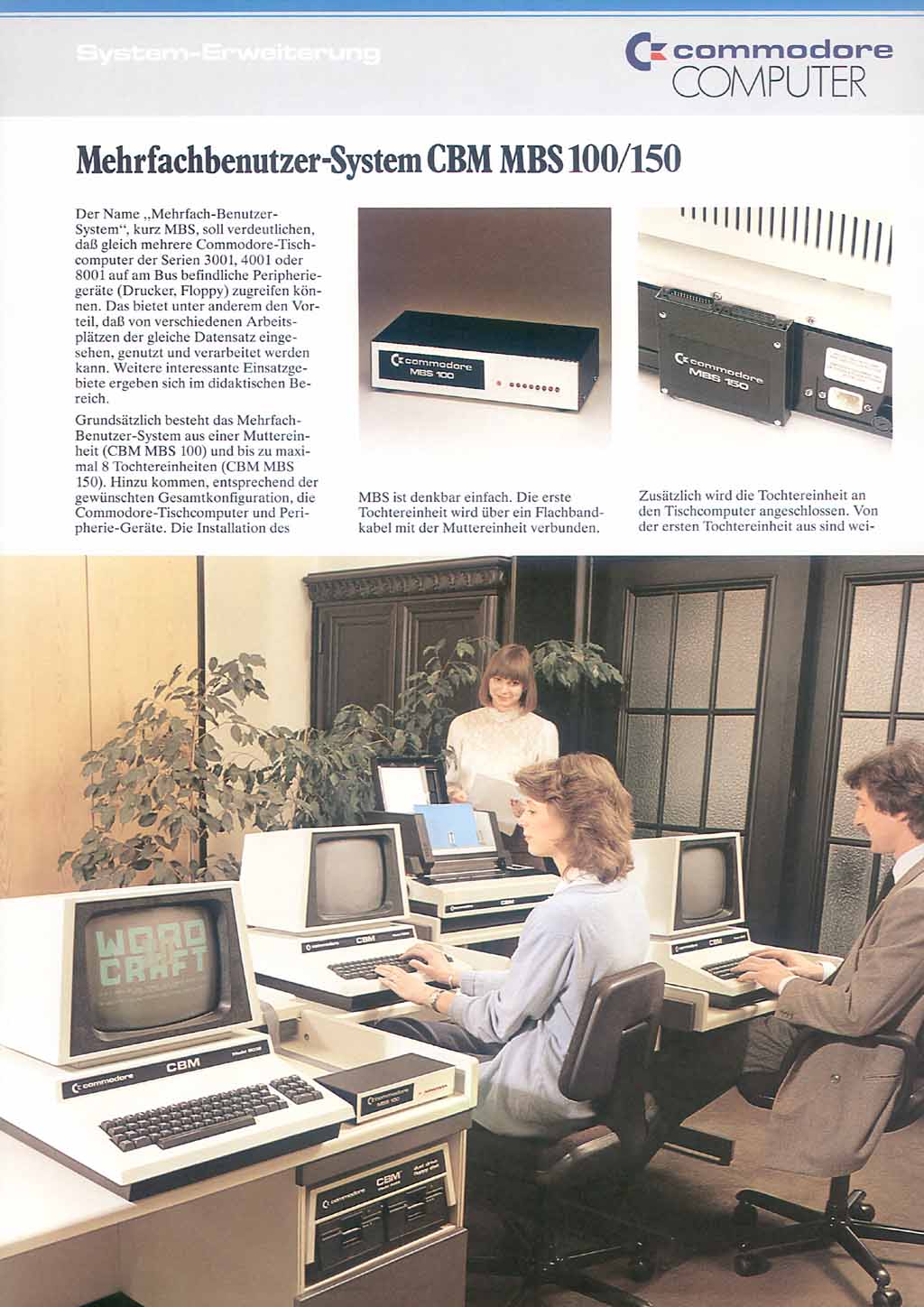Here Commodore presents the (M)ehrfach(B)enutzer-(S)ystem. It consists of the main-unit MBS100 which can be connected with up to 8 daughter-units MBS150. Like in a small network it is possibel to access with several computers to one-off peripheral devices, like disk-drives or printers. This joint access of multiple computers to one disk-drive with its small capacity seems to be not very useful. The usage of a hard-disk-drive is preferable to it.