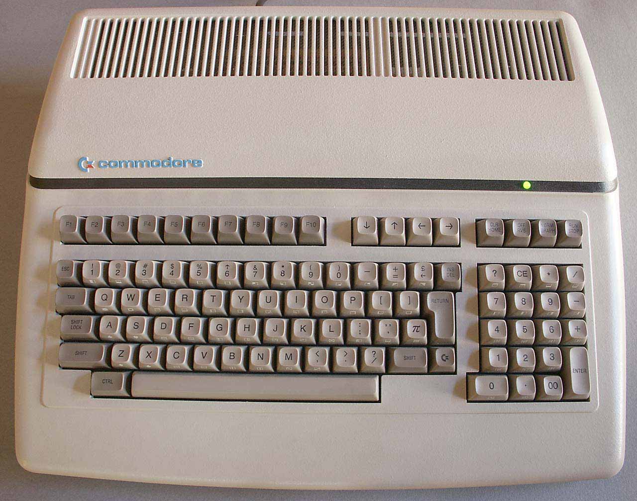 Von Aussen läßt sich der P500 von seinem Zwillingsbruder CBM6X0 nur durch die grüne Leuchtdiode und zwei zusätzliche Joystickports auf der Rückseite unterscheiden. Daß auf dem links gezeigten Bild der Rückseite weder Typenschild noch der Aufkleber mit Angaben zur Stärke der Sicherung und der benötigten Betriebsspannung zu finden sind, ist schnell erklärt: Es handelt sich bei meinem Gerät nicht um eines der sehr seltenen "Originale", sondern um einen aus Originalteilen bestehenden "Eigenbau". Die bereits gefertigten Einzelteile wurden nämlich, als Commodore die Markteinführung des P500 "kippte", an den Elektronikhändler "Völkner" abgegeben, der diese dann billig verkaufte.