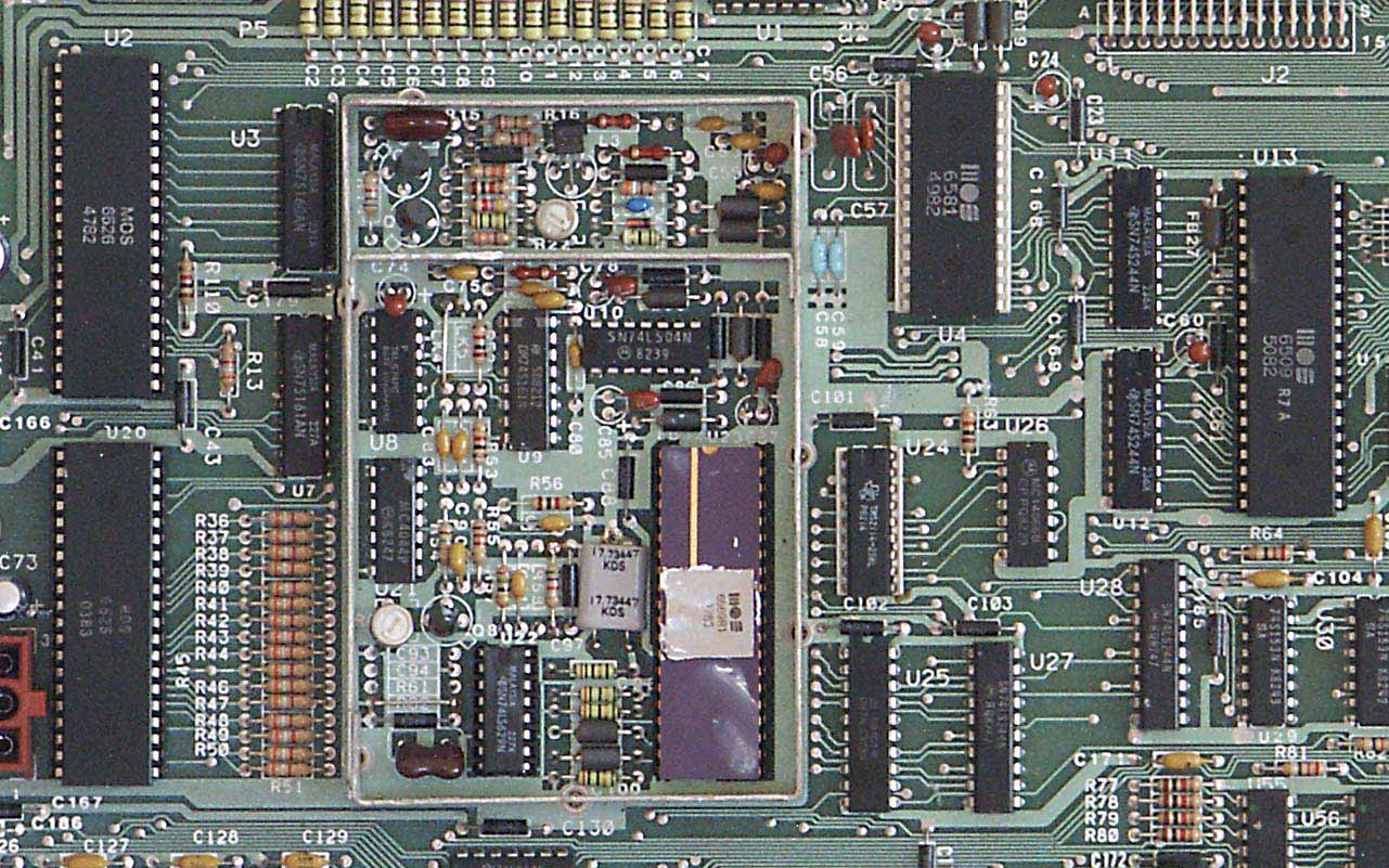 Unter der Metallabschirmung rechts im Bild ist das Videoteil untergebracht, das auf dem nächsten Bild zusammen mit den umliegenden Chips ohne Abdeckung zu sehen ist. Dort sieht man, von rechts nach links, den Prozessor 6509, den bei allen CBM-II-Rechnern eingebauten Soundchip 6581 und, innerhalb der Metallabschirmung, den bereits angesprochenen VIC-II. Am linken Bildrand sind noch die, unter Anderem für die Game-Ports zuständige, CIA 6526 und eines der beiden Tri-Port-Interfaces 6525 zu erkennen. Dieses hier bedient den IEEE-488-Bus.