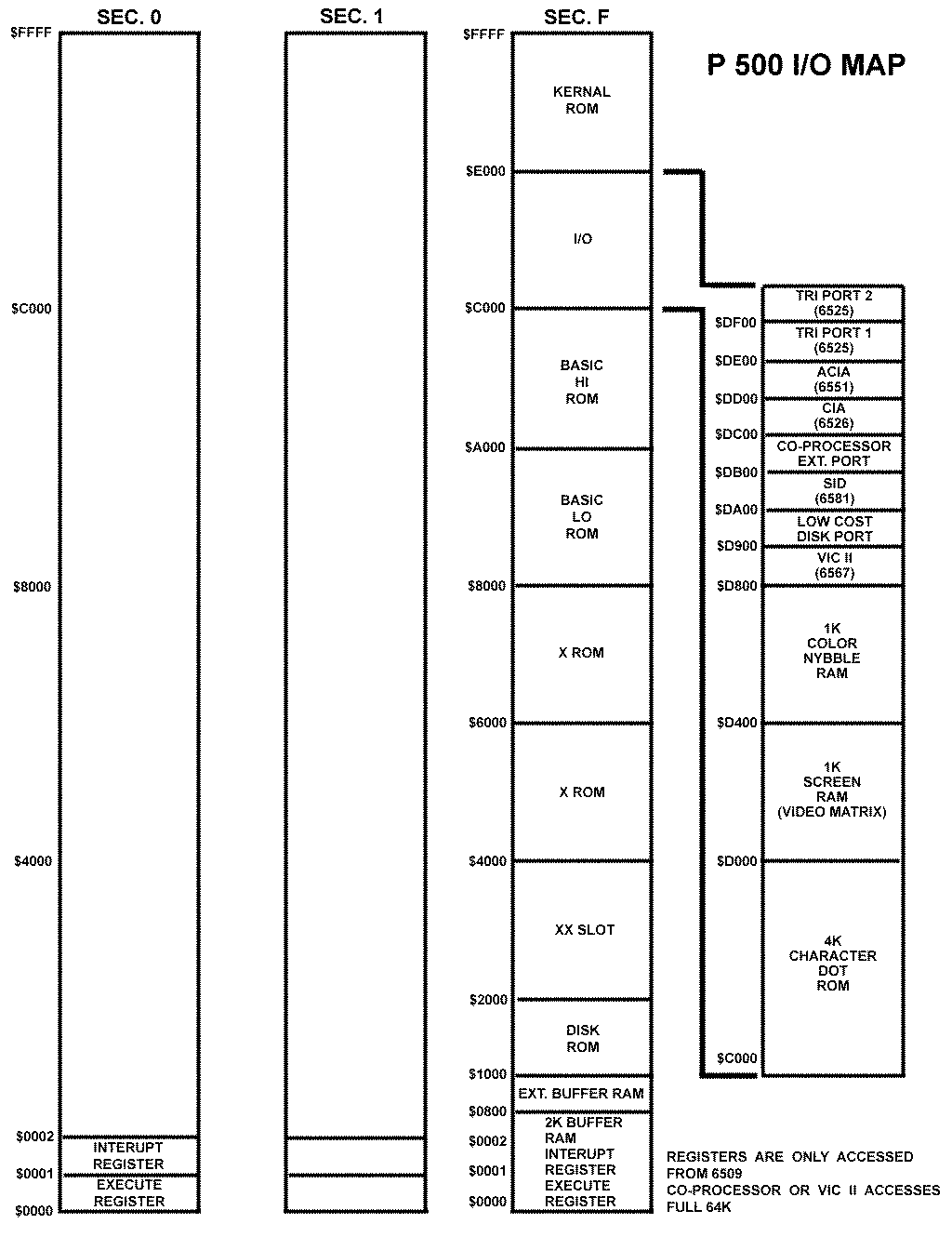 Dieser erzeugt im Textmodus ein Bild von 25 Zeilen mit je 40 Zeichen, die in 16 verschiedenen Farben dargestellt werden können. Außerdem ist es im "Hochauflösungs-Modus" möglich, bis zu 64000 Bildpunkte einzeln anzusprechen. Dieser Chip zeichnet auch dafür verantwortlich, daß der Prozessor in dieser Maschine nur mit 1MHz getaktet wird. Alle anderen Maschinen der CBM-II-Serie hingegen werden mit einer Taktfrequenz von 2MHz betrieben, da der dort eingebaute, nur monochrom darstellende, Grafikchip vom Typ 6545 CRTC dieses zuläßt. Der RAM-Speicher hat eine Größe von 128kB, der aufgrund des nur 16 Bit breiten Adressbusses der 65XX-Prozessoren in zwei sogenannte "Bänke" von 64kB aufgeteilt ist. Ursprünglich war geplant, den Rechner in den 4 Speicherausbaustufen von 64kB (P505), 128kB (P510), 192kB (P515) und 256kB (P520) anzubieten. Da jedoch niemals ein Kunde die von ihm gewünschte Speichergröße auswählen durfte, sondern die wenigen existenten (echten) Geräte als Anschauungsobjekte an Computerläden und Fachzeitschriften-Verlage "verschenkt" wurden, besitzen alle bekannten Maschinen die Ausbaustufe von 128kB!