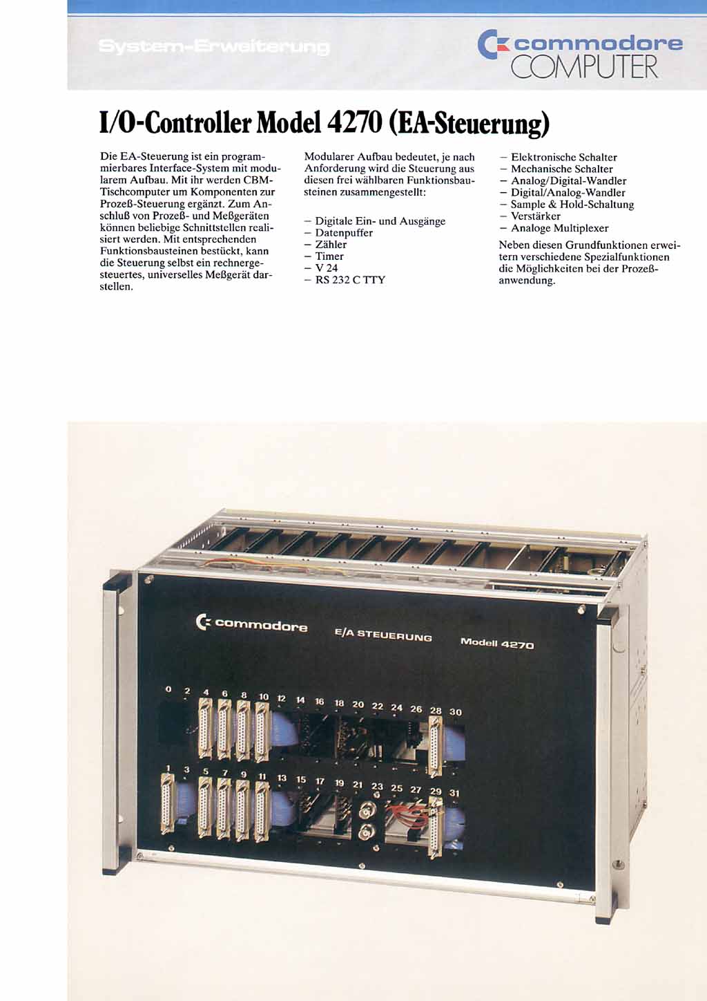 In 1982 the Programmable Interface System CBM4270 came out. It consists of a 19"-rack which could be equipped with up to 8 interface-boards with different functionality. With this controller the opportunities of the CBM-Computers were extendet significant.