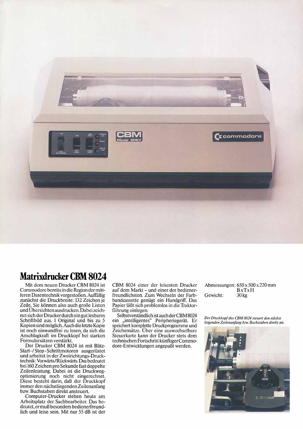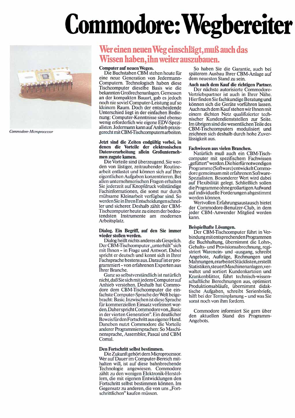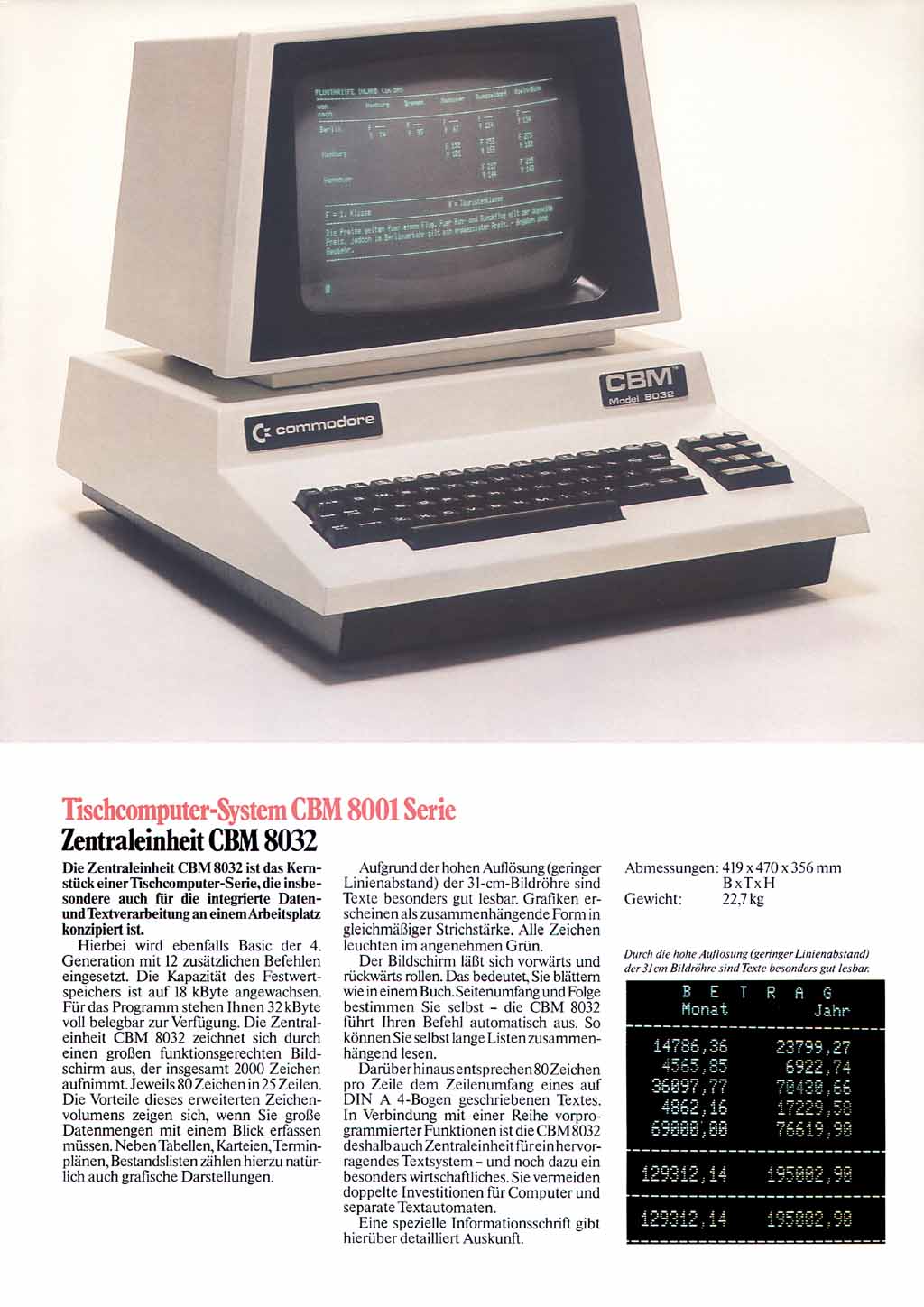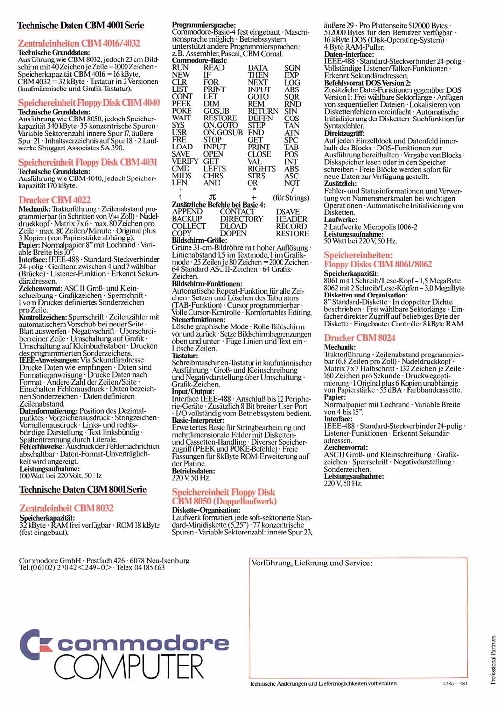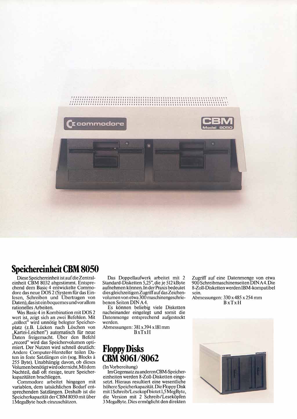 This prospectus of the year 1981 gives an overview of the CBM4000 and CBM8000 series and their periphery. Even it describes which computer is suitable for which purpose and how simple it is to operate them in the daily use. Typically for Commodore once more there are pictures of "Dummies". Later the CBM4031 were not installed in the shown case, but in the housing of the CBM2031, which had the same technology. Furthermore I do not know anything about the real existence of the 8"-disk-drives CBM8061 and CBM8062 described at page 10.