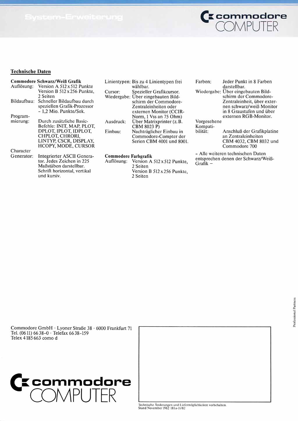 Likewise in the year 1982 the CBM4000 as well as the CBM8000 becomes capable of Hires-graphics! With this additional board it is possible to depict a resolution of 512 x 512 pixels at the integrated screen. The flyer includes the announcement of a graphics extension for the 700 series too. This extension should be able to depict each pixel in one of eight colours in the same resolution. An external monitor is required of course.