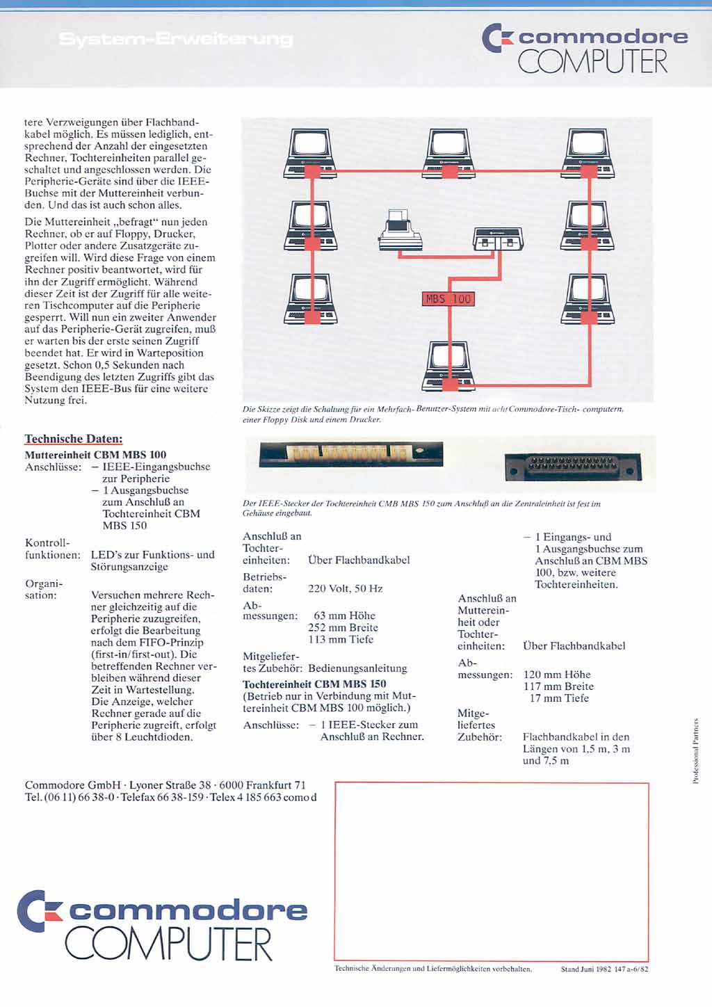 Here Commodore presents the (M)ehrfach(B)enutzer-(S)ystem. It consists of the main-unit MBS100 which can be connected with up to 8 daughter-units MBS150. Like in a small network it is possibel to access with several computers to one-off peripheral devices, like disk-drives or printers. This joint access of multiple computers to one disk-drive with its small capacity seems to be not very useful. The usage of a hard-disk-drive is preferable to it.