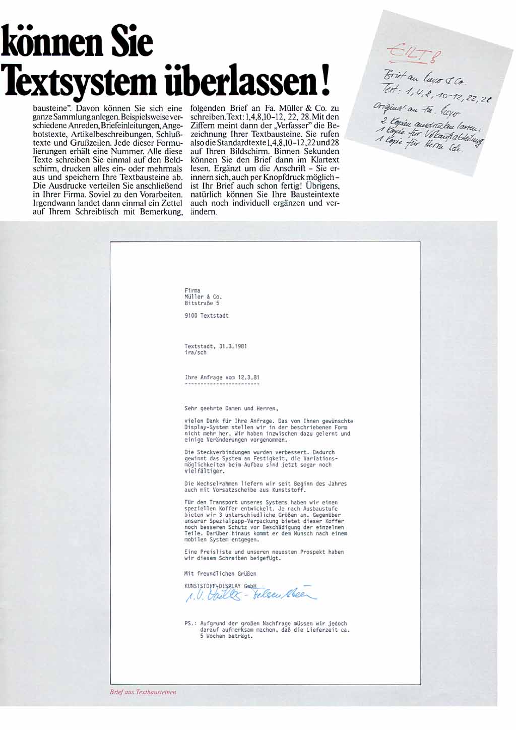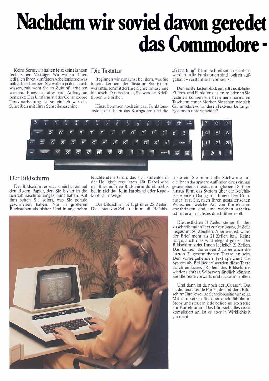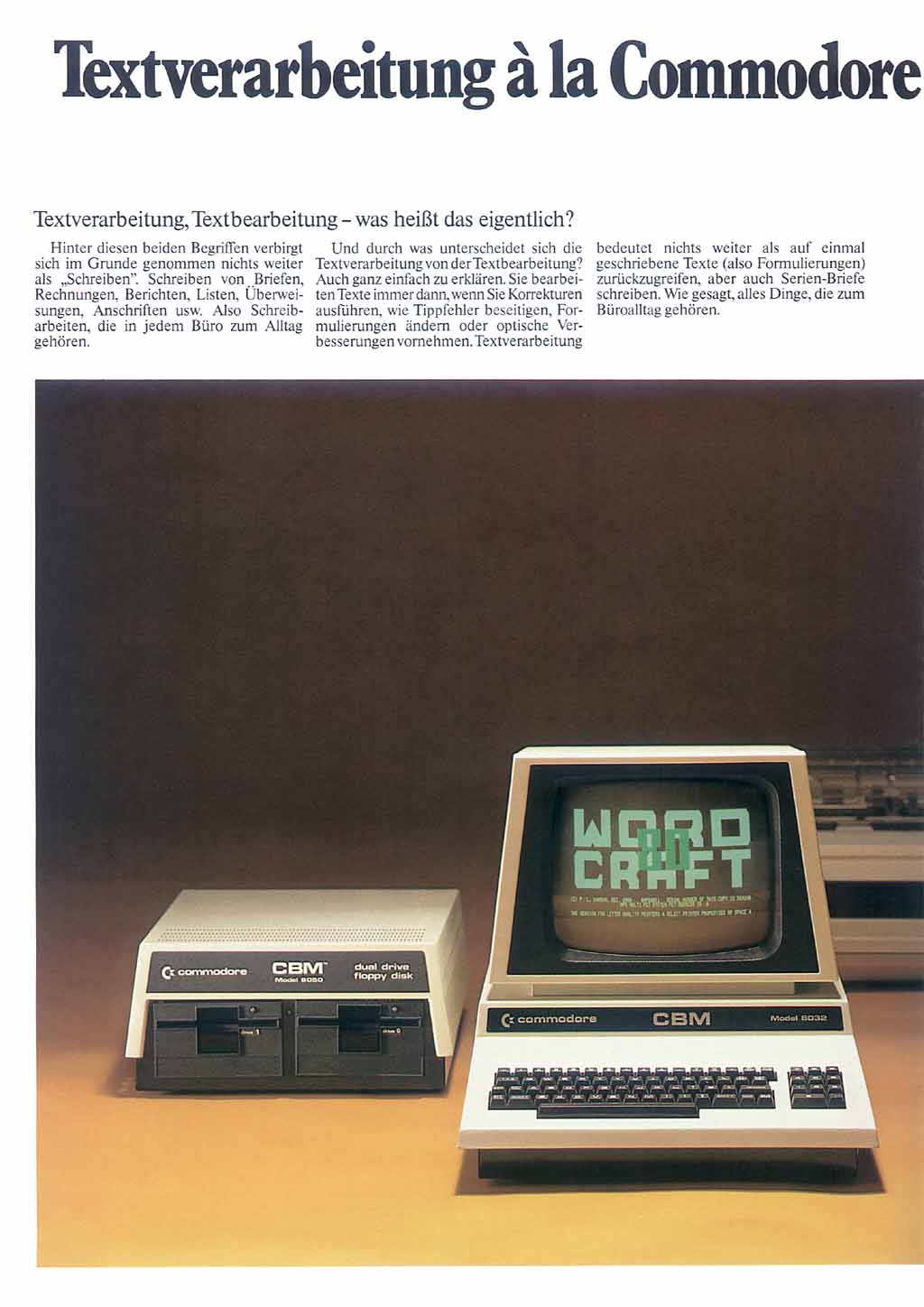 A prospectus dated from the year 1981 which describes the already very comfortable wordprocessor "Wordcraft 80" made by Commodore.